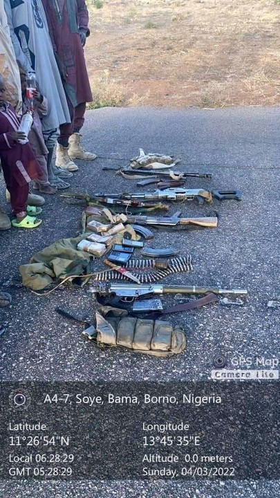 “Two AK 47 riffles, one G3 riffle 1 X FN riffle, 1 X PKT gun, 120 Rounds of 7.62MM Nato, 31 RDS X 7.62MM special, 3 AK 47 extra magazines, 3 X G3 extra magazines, 1, 36 HG, 2, knives and the sum of N600,000 was handed over to the troops by the insurgents”.