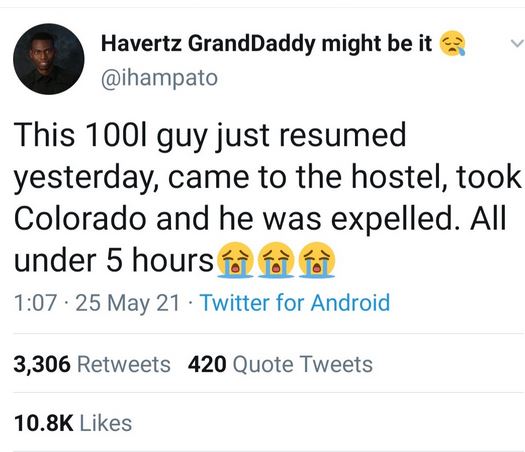He tweeted: “This 100l guy just resumed yesterday, came to the hostel, took Colorado and he was expelled. All under 5 hours.