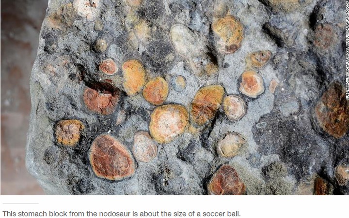 In life, the dinosaur — a type of ankylosaur — weighed more than a ton. But it lived off of plants and favored ferns, based on the contents of its stomach. The chunk resembling its stomach is about the size of a soccer ball.
