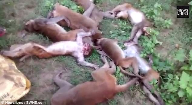 Forest department workers found the monkeys on Monday and an upsetting video shows them stuffing the bodies in polythene bags.