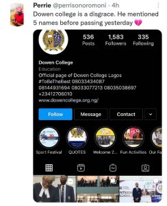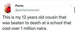 He wrote: “This is my 12 years old cousin that was beaten to death at a school that cost over 1 million naira.