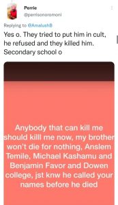 They tried to put him in cult, he refused and they killed him. Secondary school o.Anybody that can kill me hould kill! me now, my brothe won’t die for nothing, Anslem Temile, Michael Kashamu and Benjamin Favor and Dowen college, jst knw he called your names before he died.