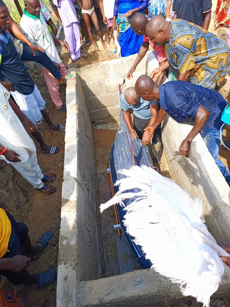 A 120-year-old woman was buried in a customised dolphin-shaped casket in Oboro community, Bomadi Local Government Area of Delta State.