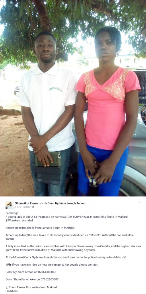 Facebook user, Shom Akor Fanen is seeking for useful information on how to locate the family of a 13-year-old girl identified as Satdir Turven, stranded in Makurdi, Benue State capital after arriving from Onitsha.