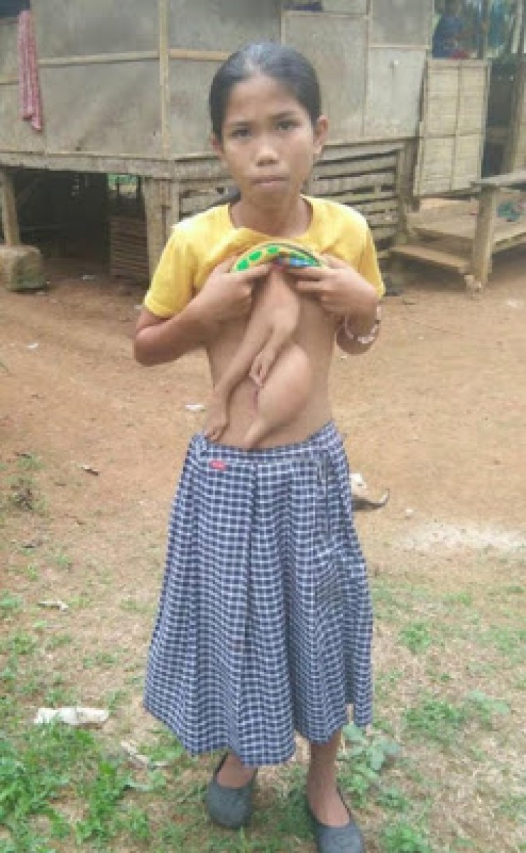 Veronica Cominguez, 14, was born with the limbs and an oblong-shaped torso growing from her chest in Iligan City, Philippines. The extra parts – belonging to a parasitic twin which did not develop properly – have continued to grow with her. She even cleans her living ”twin” and cuts their finger nails for them.