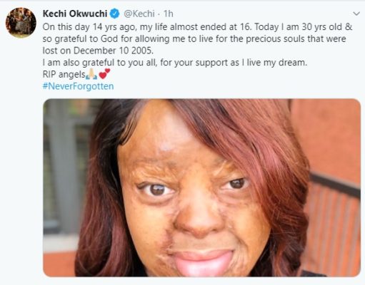 Popular plane crash survivor, Kechi Okwuchi has expressed thanks to God as she took to Twitter to celebrate the 14th anniversary of the plane crash that nearly killed her, to remember the victims of the Sosoliso plane crash. Kelechi, now 30, was one of the 110 people on board the ill-fated Sosoliso Airlines Flight 1145 on December 10, 2005. She was one of the sixty-one secondary school students from Loyola Jesuit College who were going home for the Christmas holiday. The flight from Abuja crash-landed at Port Harcourt International Airport. It slammed into the ground and burst into flames. Immediately after the crash, seven survivors were recovered and taken to hospitals, but only two people survived. Kechi is one of the two survivors.