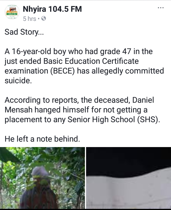 A 16-yr-old Ghanaian boy has committed suicide after he failed an exam.He left a written note before taking his life.Below is what popular Ghanaian FM Nhyira shared on FB….