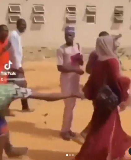 In the video which has since gone viral, the students were seen dragging the cloth of the female student, shouting “mai Abaya” at her.