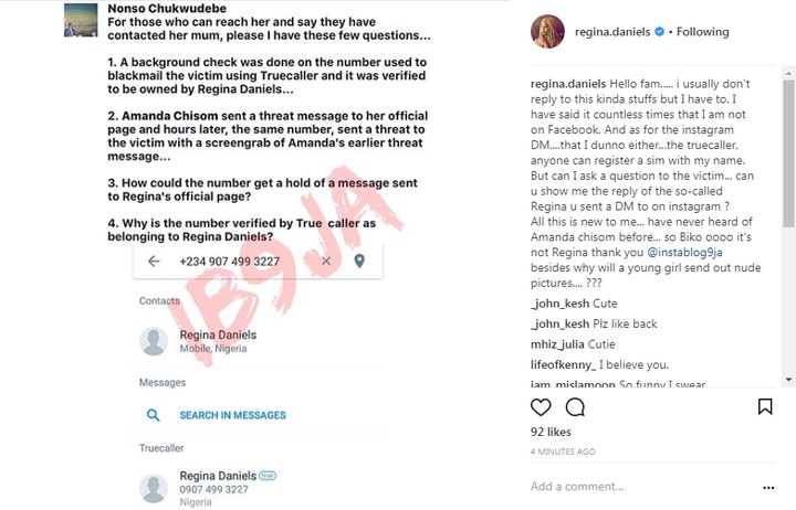 Hello fam….. i usually don’t reply to this kinda stuffs but I have to. I have said it countless times that I am not on Facebook. And as for the instagram DM….that I dunno either…the truecaller, anyone can register a sim with my name. But can I ask a question to the victim… can u show me the reply of the so-called Regina u sent a DM to on instagram ?