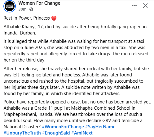 A 17-year-old girl, Athabile Khanyi, died by suicide after she was brutally gang-raped in Inanda, Durban, South Africa.
