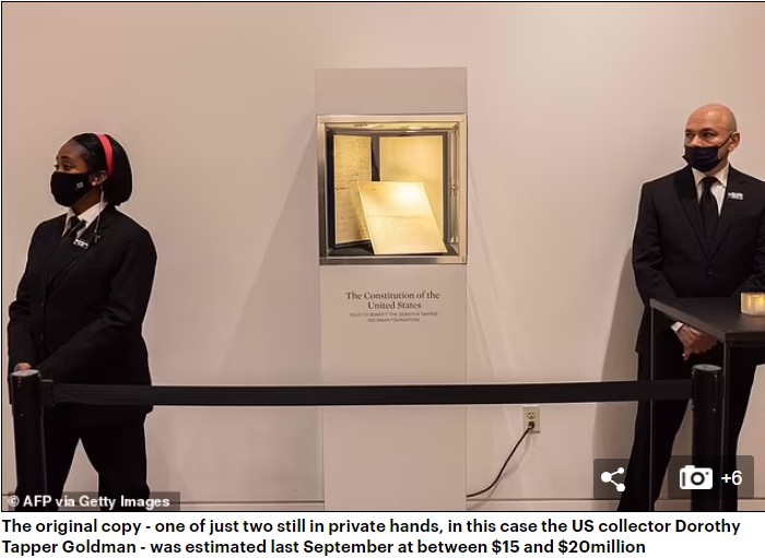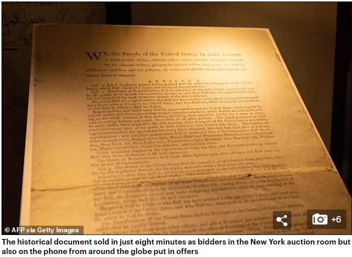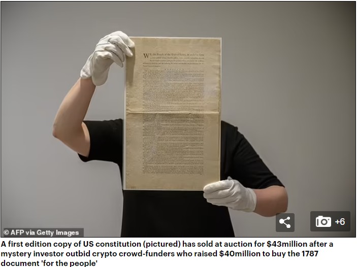 A first edition copy of US constitution has sold at auction for $43million after a mystery investor outbid crypto crowd-funders who raised $40million to buy the 1787 document ‘for the people’.
