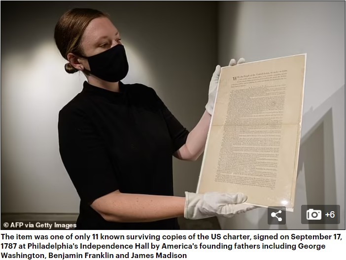 Sotheby’s auction house, which staged the sale, said the item was one of only 11 known surviving copies of the US charter, signed on September 17, 1787 at Philadelphia’s Independence Hall by America’s founding fathers including George Washington, Benjamin Franklin and James Madison.