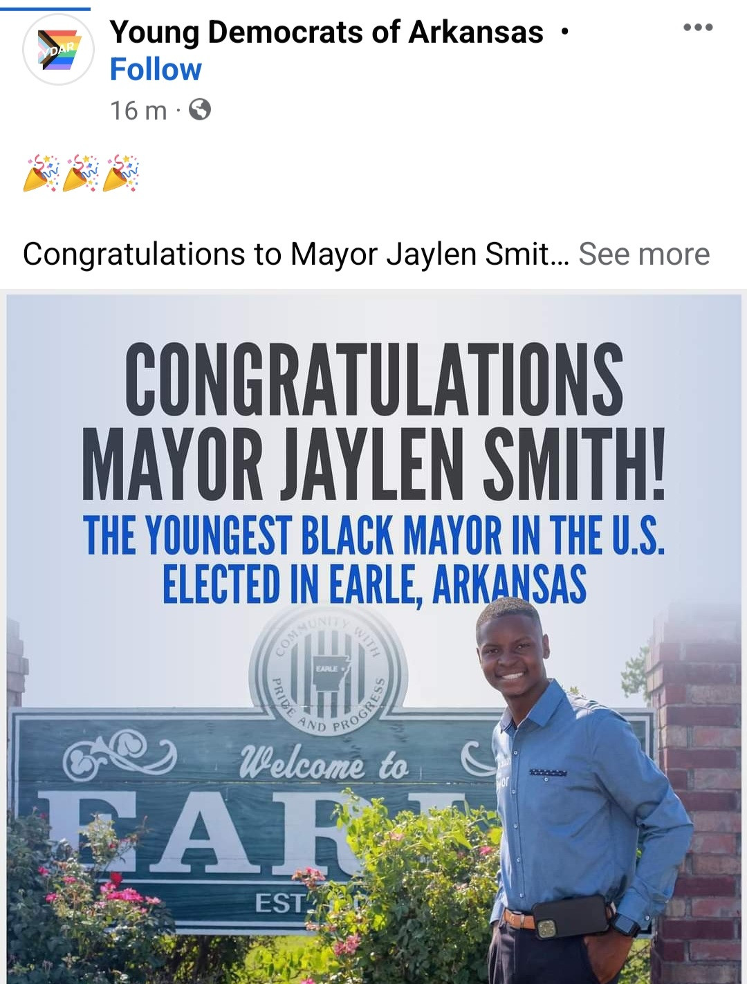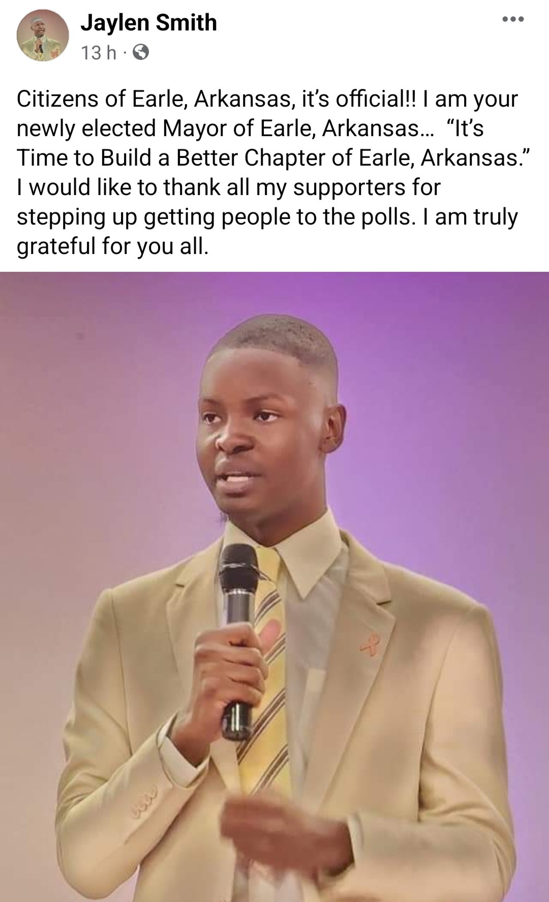 Smith announced his win in a Facebook post, saying: “Citizens of Earle, Arkansas, it’s official!! I am your newly elected Mayor of Earle, Arkansas… ‘It’s Time to Build a Better Chapter of Earle, Arkansas.’ I would like to thank all my supporters for stepping up getting people to the polls. I am truly grateful for you all.”