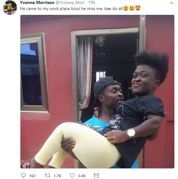 They are happy and thats all that matters, Twitter user Yvonne Morr is going viral yea, After she shared loved up photos with her Man as he paid her a Surprise visit at her Place of work..