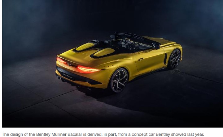 The Bacalar is named after a lake in Mexico’s Yucatan peninsula known for its beauty. While it bears some resemblance to the convertible Bentley Continental GTC, the Bacalar shares none of its body parts with that car besides the door handles, Bentley said.