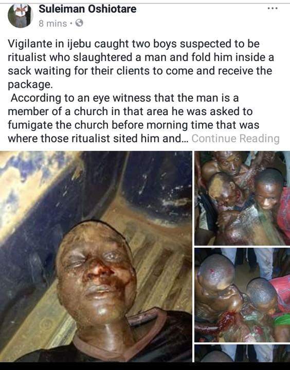 According to Suleiman,two ritualists were caught in Ijebu by vigilante after they slaughtered in man and wrapped him in a sack.Here is what he shared on Facebook…
