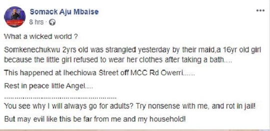 Somkenechukwu 2yrs old was strangled yesterday by their maid,a 16yr old girl because the little girl refused to wear her clothes after taking a bath….