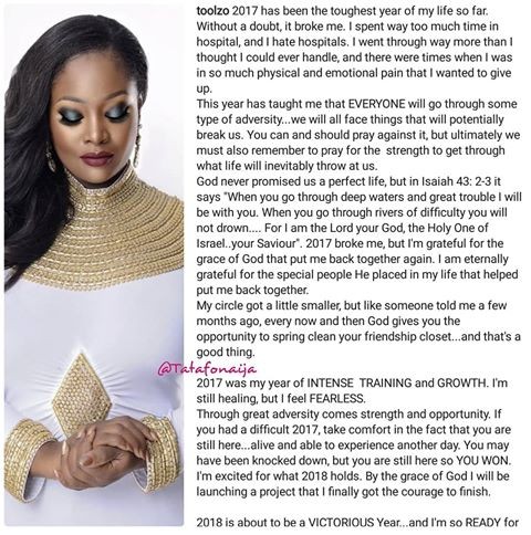 Nigerian Media Mogulette, Toolz is setting her pace for 2018 and she cant wait to cross over to a new year ,she said 2017 was one of the toughest year she had experienced in her entire life,she revealed that this year recorded the highest number of times age paid different hospitals a visit.