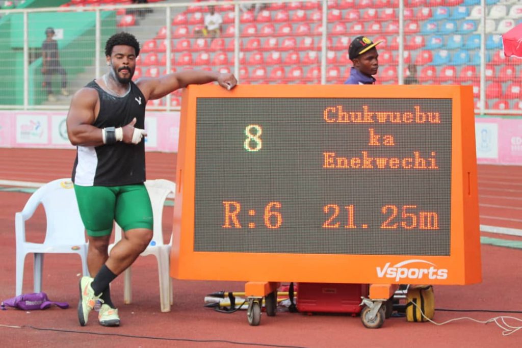 Reigning African Games and African Athletics Championships Shot Put champion, Chukwuebuka Enekwechi set a new 21.25m personal season’s best at the 2022 Nigerian Athletics Championships in Benin City to successfully defend the Shot Put title he first won last year.