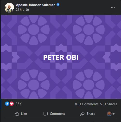 Apostle Johnson Suleman of Omega Fire Ministries has declared support for the presidential ambition of Peter Obi.