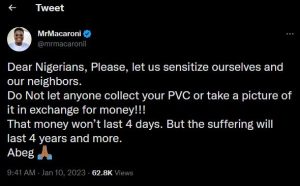 Adebayo tweeted, “Dear Nigerians, please let us sensitise ourselves and our neighbours. Do not let anyone collect your PVC or take a picture of it in exchange for money!!! That money won’t last 4 days. But the suffering will last 4 years and more. Abeg.