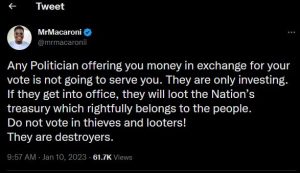 “Any Politician offering you money in exchange for your vote is not going to serve you. They are only investing. If they get into office, they will loot the Nation’s treasury which rightfully belongs to the people.