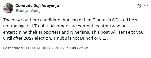 ‘’The only southern candidate that can defeat Tinubu is GEJ and he will not run against Tinubu. All others are content creators who are entertaining their supporters and Nigerians. This post will sense to you until after 2027 election. Tinubu is not Buhari or GEJ.”