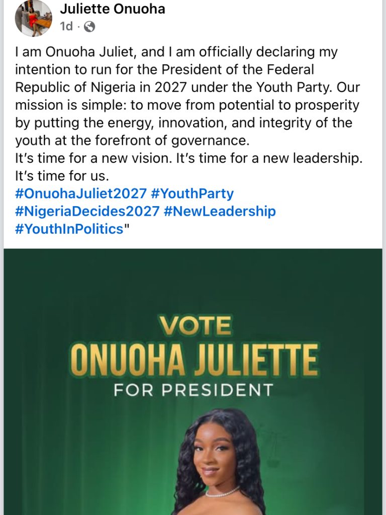 A young Nigerian lady, Onuoha Juliet, has officially declared her intention to contest the 2027 presidential election.