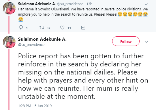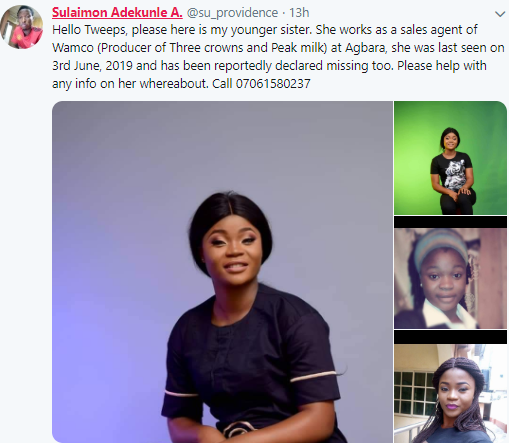 Her brother, Sulaimon Adekunle, who solicited public help in locating his sister, said Oluwakemi works as a sales agent at a company in the Agbara axis of Lagos state and had been missing since on June 3rd.