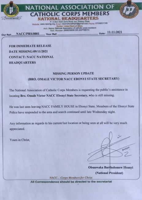 His roommate, Innocent Ujah, who first declared him missing, told the police that Omah left the National Association Of Catholic-Church Corps Members (NACC) Family House around 6 pm on November 9, 2021, and has not been seen since.