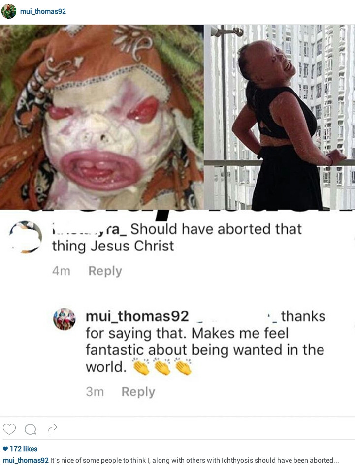 Thomas then shared a screenshot of the comment on her page and wrote “It’s nice of some to think I, along with others with Ichthyosis should have been aborted”