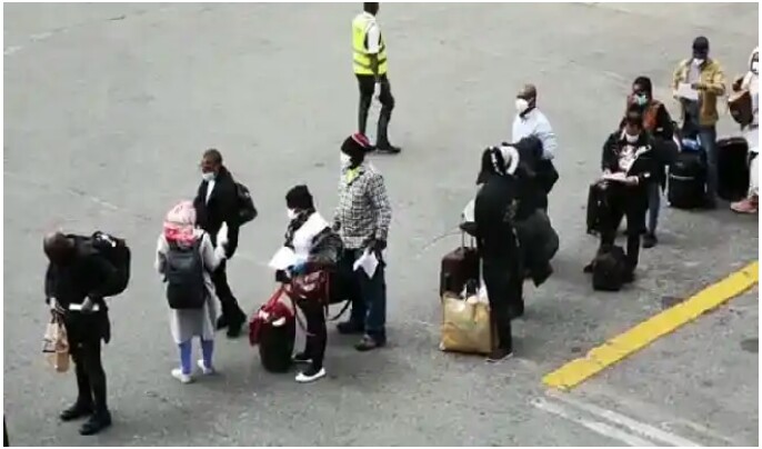 The returnees disembarked from the aircraft after over 30 minutes through a motorised gangway rather than the usual avio-bridge.