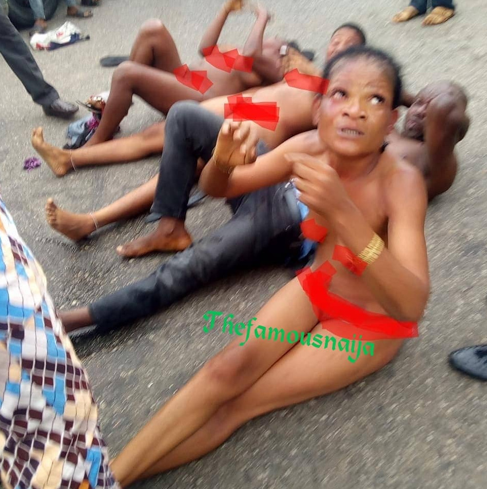Video shows how they were being shamed by crowd who gathered to take a glimpse of the beautiful kidnappers’ body as some of the guys there were seen in the video that emerged online fixing their eyes on the ladies exposed private parts.