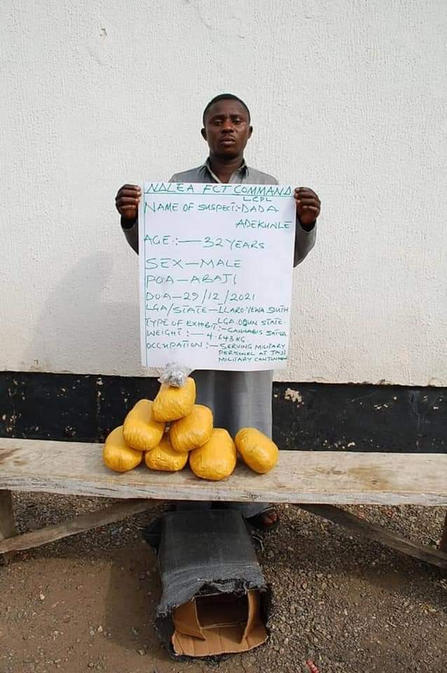 In the same vein, another impersonator, Dada Adekunle was on Wednesday arrested along with his 60-year-old accomplice, Usman Isa, in Abaji area of FCT with 15.843kg Cannabis, while 20kg of the same drug was seized from Alfred Aminu who was intercepted at Gwagwalada same day.