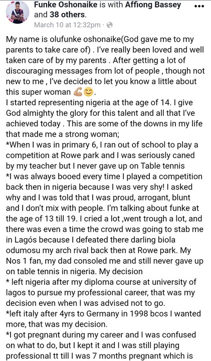 Nigerian table tennis legend, Funke Oshonaike took to her Facebook page to recount her life experiences. According to her, she was sexually abused, battered and duped by a man 10 years older than me.