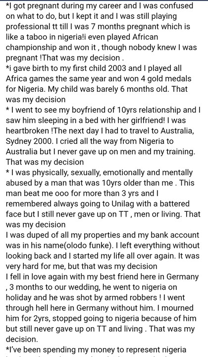 *I got pregnant during my career and I was confused on what to do, but I kept it and I was still playing professional tt till I was 7 months pregnant which is like a taboo in nigeria!i even played African championship and won it , though nobody knew I was pregnant !That was my decision .