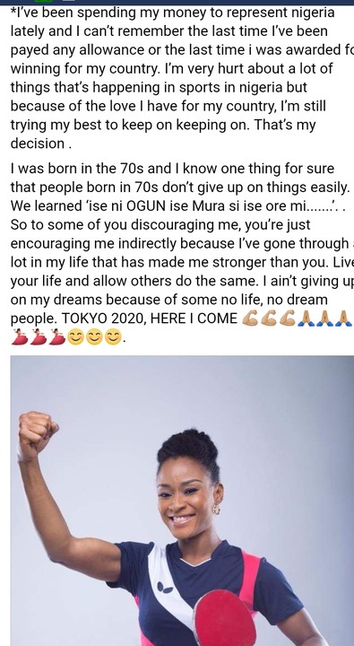 I was born in the 70s and I know one thing for sure that people born in 70s don’t give up on things easily. We learned ‘ise ni OGUN ise Mura si ise ore mi…….’. . So to some of you discouraging me, you’re just encouraging me indirectly because I’ve gone through a lot in my life that has made me stronger than you. Live your life and allow others do the same. I ain’t giving up on my dreams because of some no life, no dream people. TOKYO 2020, HERE I COME