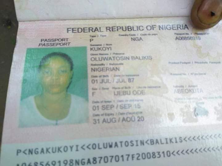 According to Facebook user Fagbile Bukunmi, the 32-year-old lady who hails from Ijebu-Ode in Ogun state has been identified as Kukoyi Oluwatosin Balkis, after she was found with her international passport.