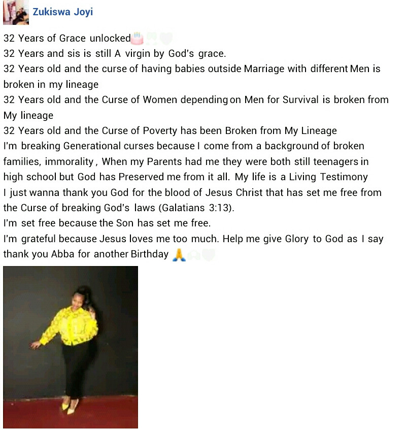 She wrote; “32 Years of Grace unlocked. 32 Years and sis is still A virgin by God’s grace”