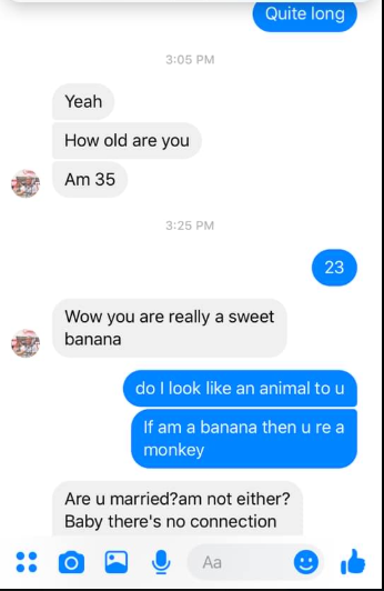 A young lady who claims to be 23 years old, has taken to social media to reveal her displeasure following her conversation with a 35-year-old admirer who wooed her on Facebook.