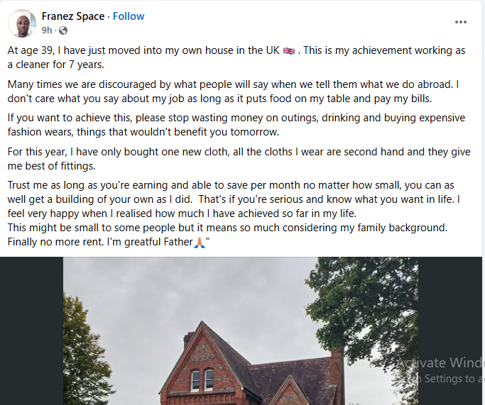 “At age 39, I have just moved into my own house in the UK. This is my achievement working as a cleaner for 7 years,” he wrote.