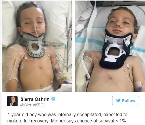 When someone is internally decapitated, their head is essentially just holding on by a thread – his skull basically separated from his spine. Less than one percent survive the injury. Those who do, need extensive surgery and wear a halo brace. This child, miraculously, didn’t have to undergo any of that