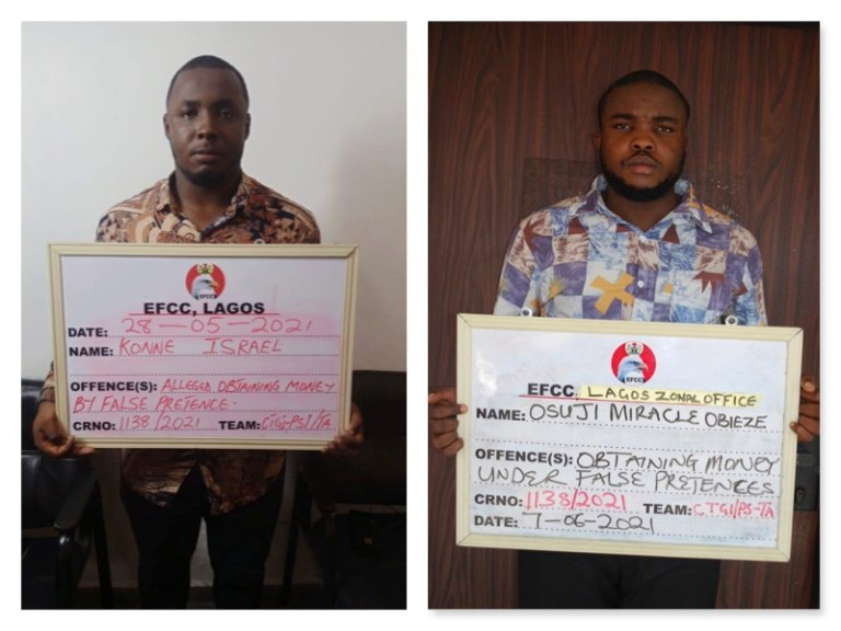Operatives of the Economic and Financial Crimes Commission have apprehended two suspected fraudsters, Konne Israel Barieeba and Osuji Miracle Obieze.