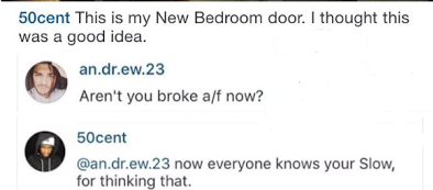 50 Cent shared this photo of a vault door as his bedroom door and captioned it..”This is my New bedroom door. I thought this was a good idea”.and got the reaction above from a fan. Of course he replied the fan, lol.