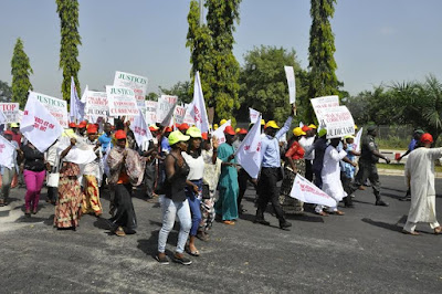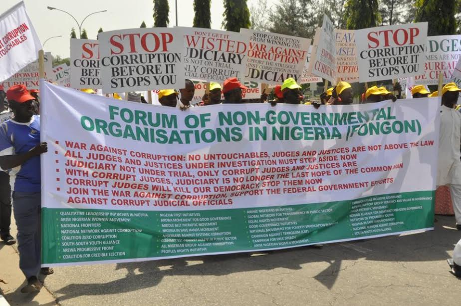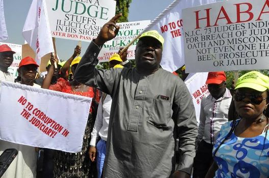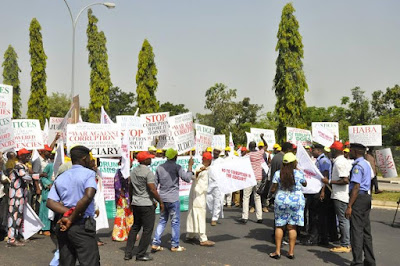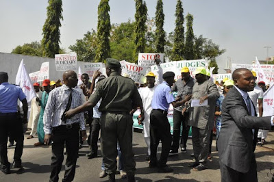 Coalition of 50 NGOs are currently staging a massive protest in Abuja against alleged corrupt practices in the judiciary. The protesters are demanding that the recently arrested serving Judges/Justices should step down until they have cleared their names in court.