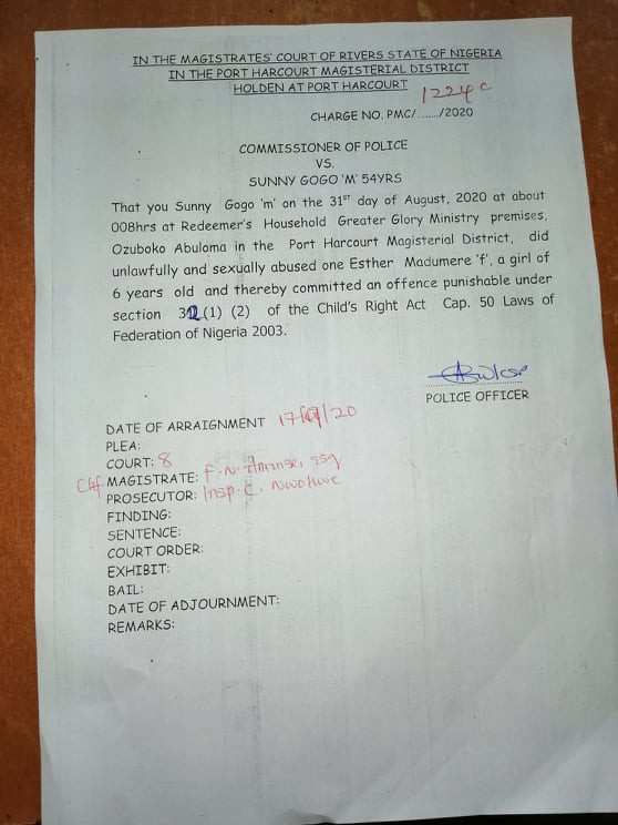 A Magistrates’ Court sitting in Port Harcourt, Rivers State has ordered the remand of a 54-year-old man, Sunny Gogo in prison custody for allegedly raping a 6-year-old girl. The court gave the order on Thursday, September 17.