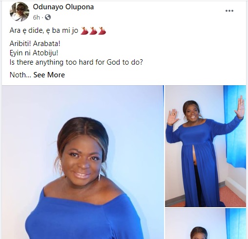 She wrote:Aribiti! Arabata!?yin ni Atobiju!Is there anything too hard for God to do?Nothing! Absolutely nothing!Weeping may endure for a night but joy comes in the morning!Triplets@54!First time pregnancy!3 boys!Congratulations my friend!God win! Funmi Ajagbe, well done!Love you so much!God has give you a new name.You shall no longer be termed forsaken!