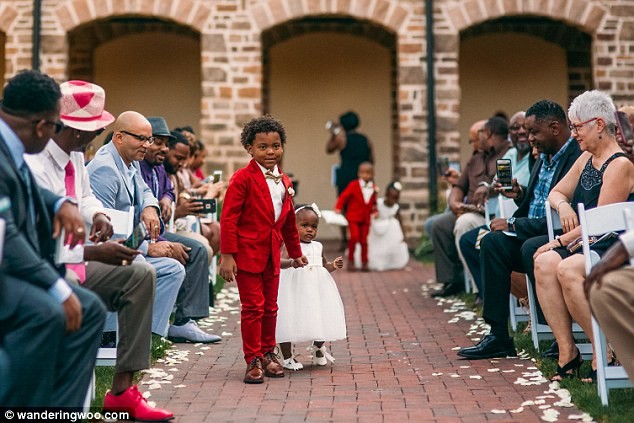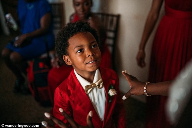 Dressed in a bright red suit as he stood at the top of the aisle in front of the groomsmen, he began bawling when he saw his mother, Tearra, walk down the aisle toward her soon-to-be husband, his dad. He is seen leaning forward to get a really good look at his mother as she walked to meet his father.
