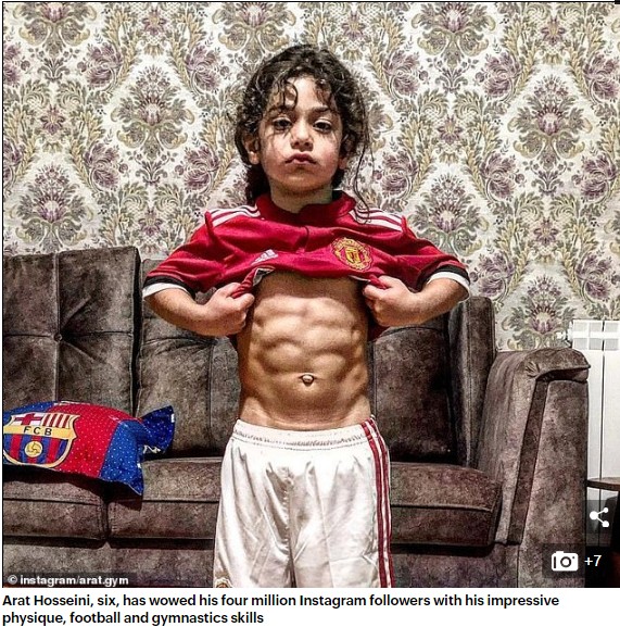 A six-year-old Iranian boy who first stunned the world with his incredible football and gymnastics skills has now amazed followers with his surprisingly chiseled physique.