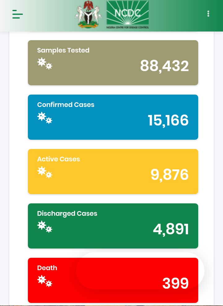 Till date, 15181 cases have been confirmed, 4891 cases have been discharged and 399 deaths have been recorded in 35 states and the Federal Capital Territory